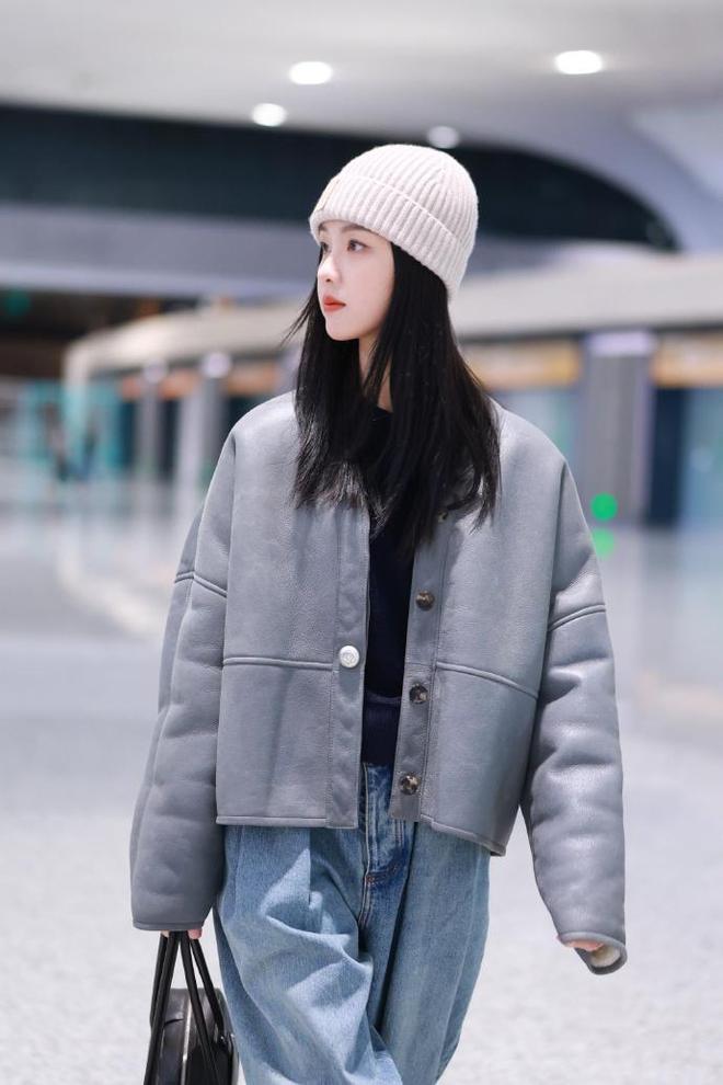 陈都灵身穿一款灰色皮毛一体外套,无领设计的短款皮毛一体外套,内搭一件黑色圆领T恤,短款设计,整个人显得又瘦又有个人气质!